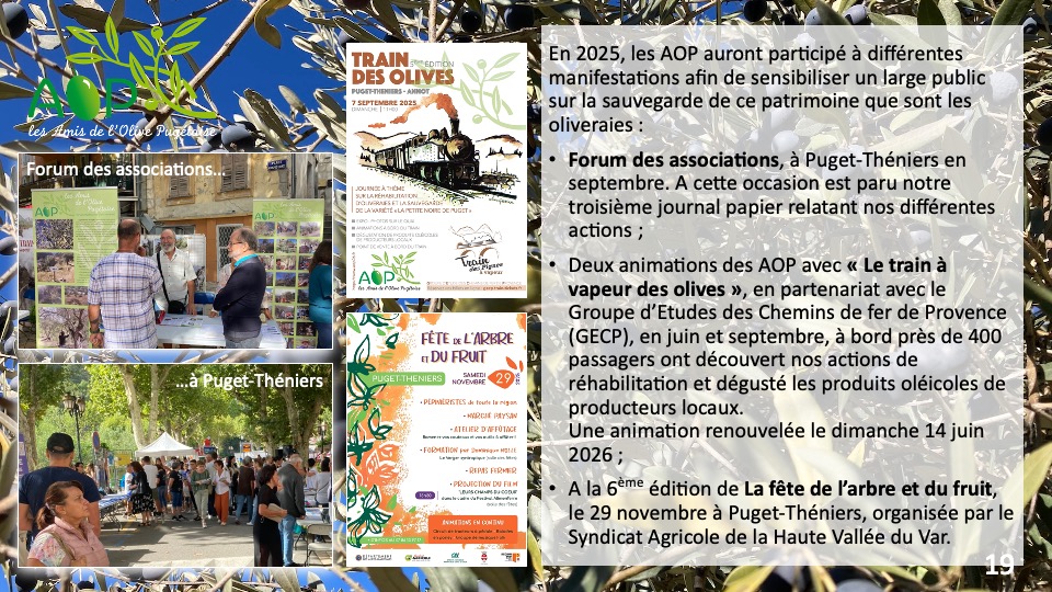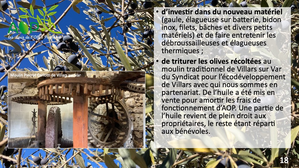 Diaporama sur les objectifs de notre association ainsi que les moyens mis en œuvre pour la réhabilitation d’oliveraies.