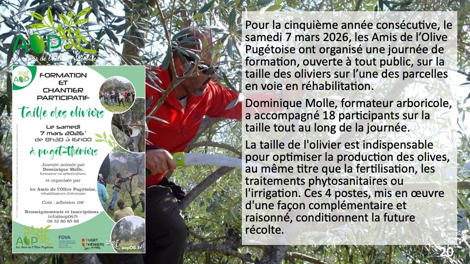 Les Amis de l’Olive Pugétoise (AOP) est une association (Loi 1901) qui agit localement sur la restauration d’oliveraies de la variété « La petite noire de Puget », variété d’olives endémique du secteur de Puget-Théniers et des communes avoisinantes et menacée de disparition.